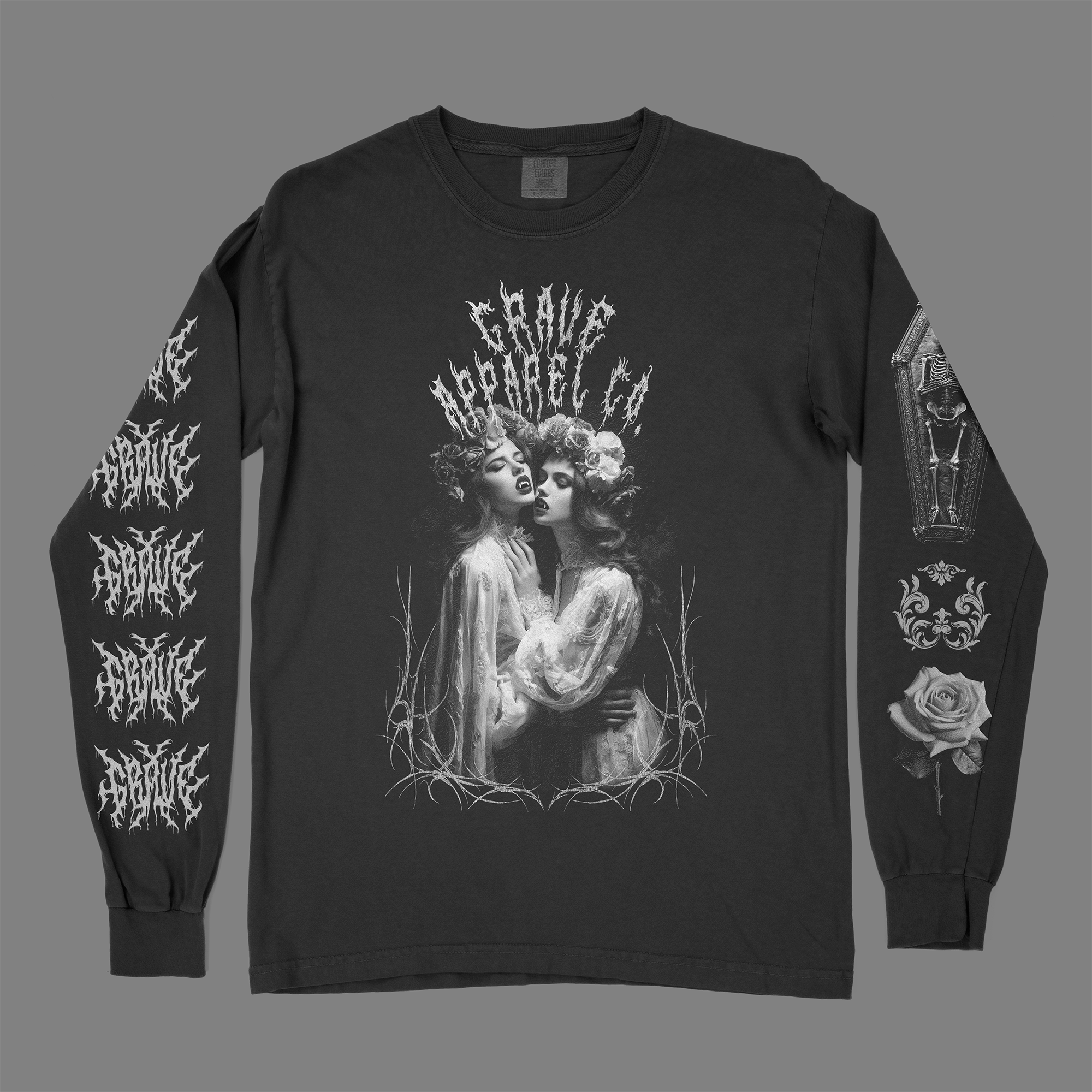 White ink on black long-sleeve, Comfort Colors 6014 garments.